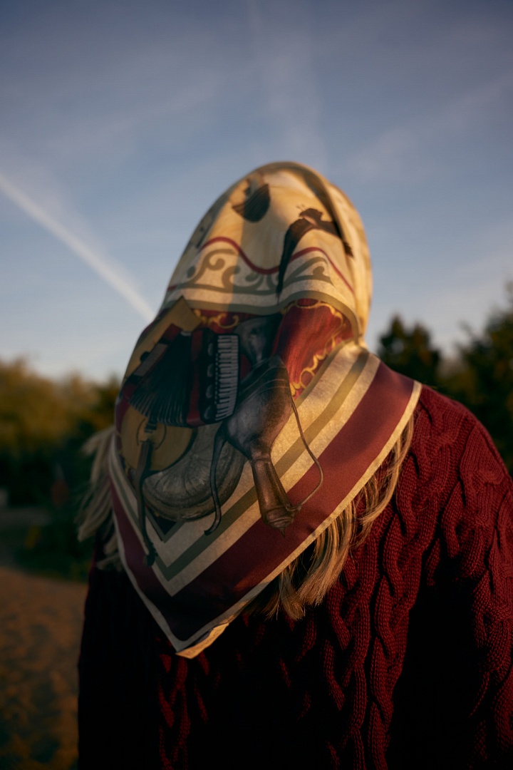 Совместная работа основана на стремлении сохранить и передать будущим поколениям важные символы и традиции Ингушетии. Ведь, как известно, «Народ, не знающий своего прошлого, не имеет будущего». На платке изображены знаковые символы республики: величественные горы, родовые башни, олицетворяющие стойкость и верность традициям, горец и горянка, символы чести и благородства, национальные музыкальные инструменты, передающие мелодии веков, пояс горянки, подчеркивающий её грацию, а также кинжал — символ мужества и защиты. *В рамках совместного проекта выпущено ровно 100 платков, каждому из которых присвоен индивидуальней номер. *Коробки для платка вручную расписаны художницей Дали Яндиевой и отличаются друг от друга.