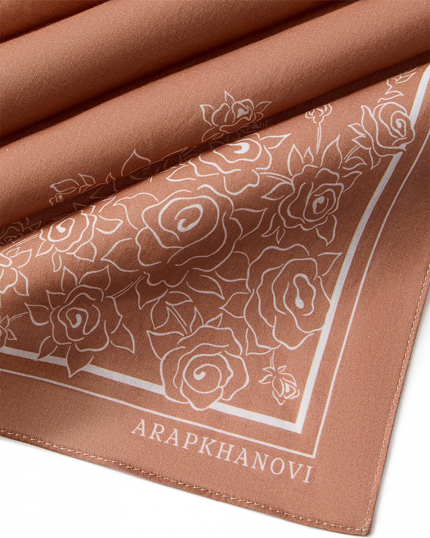 Платок из 100% хлопкового батиста с авторским принтом. На платке изображены розы, а также знаковый логотип ARAPKHANOVI. Сочетайте с другими изделиями из коллекции Sugar House.