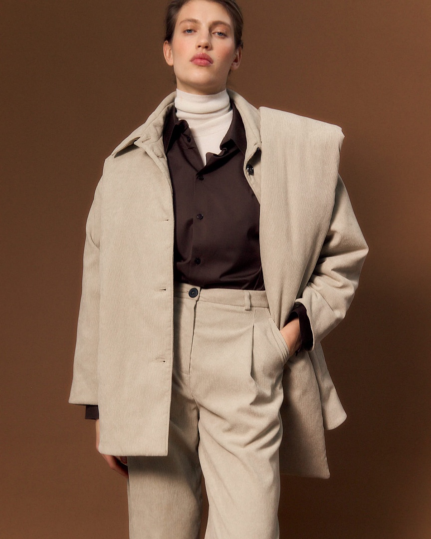 Куртка-рубашка из вельвета с утеплителем Alpolux*. Свободный силуэт, закругленные края и удобные карманы с листочкой. Засетжка на акцентные роговые пуговицы.