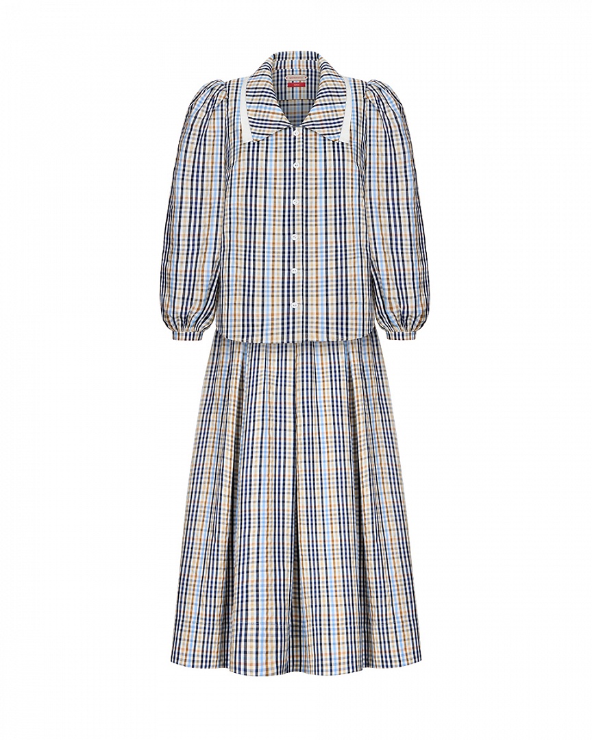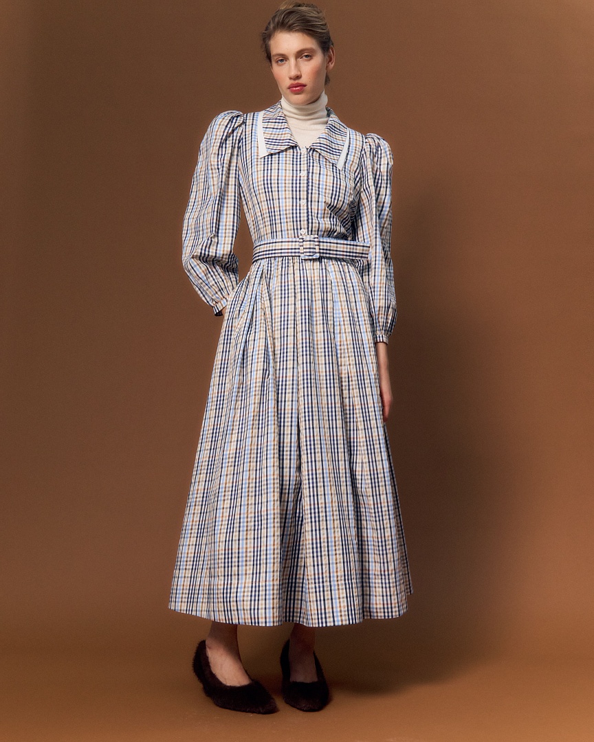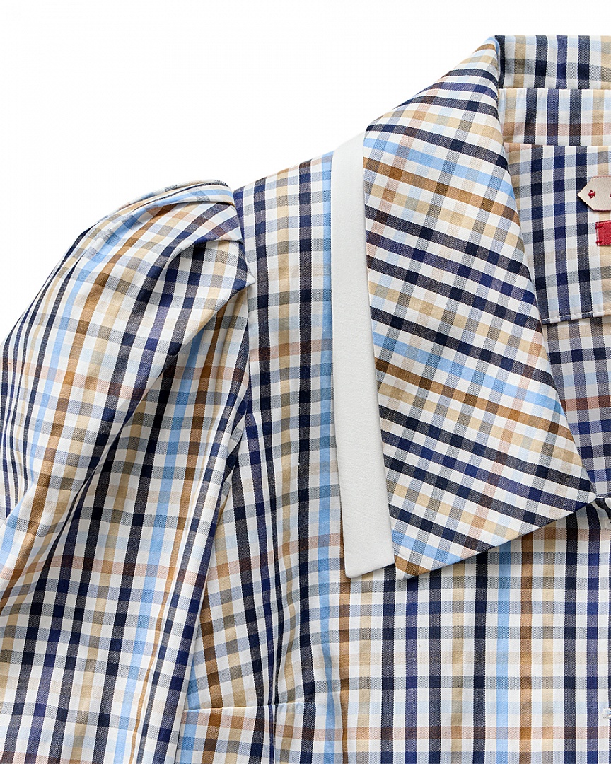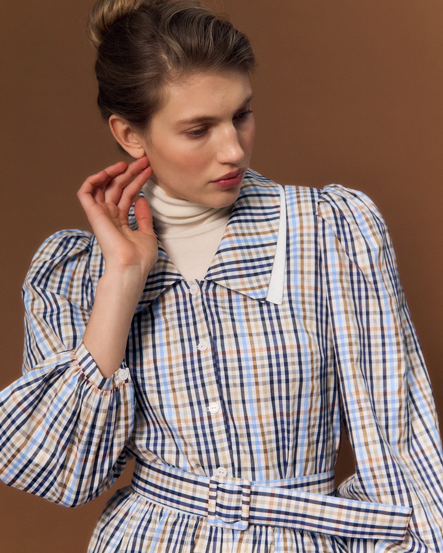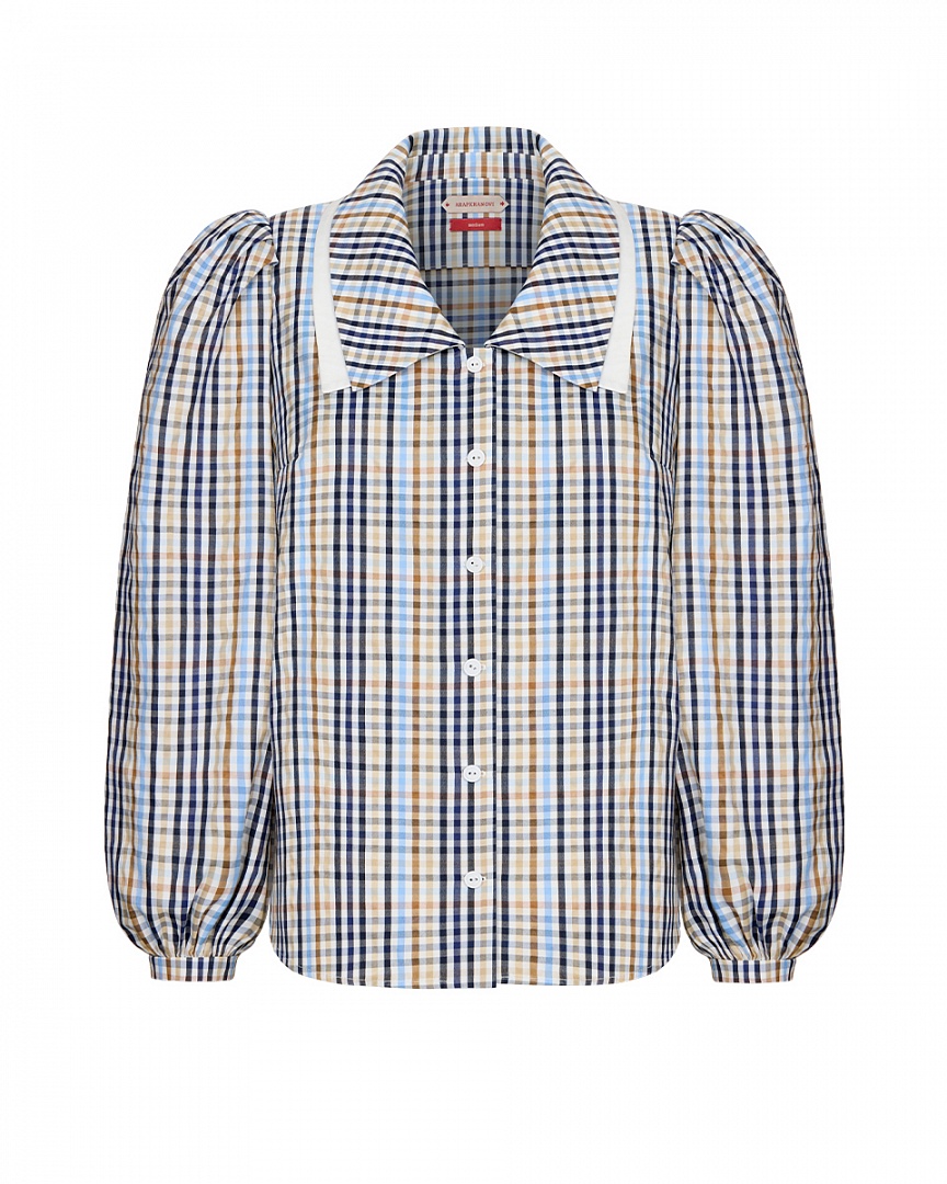 Блуза из сорочечного хлопка в клетку. Двойной воротник и пышные рукава на манжете.