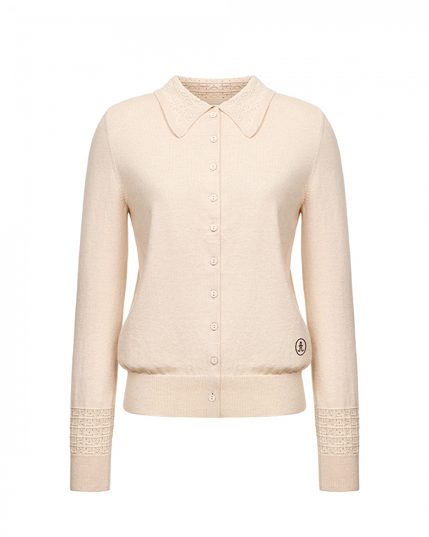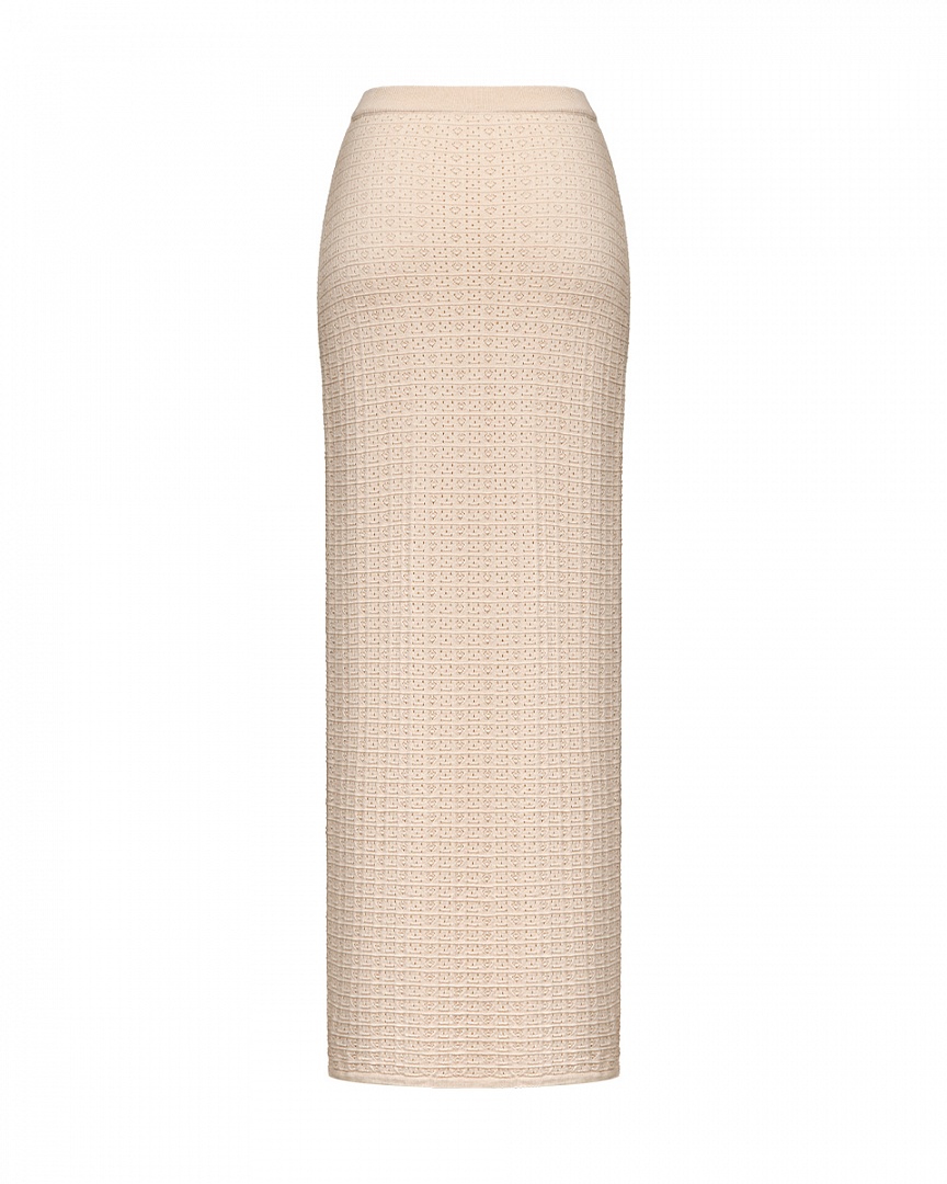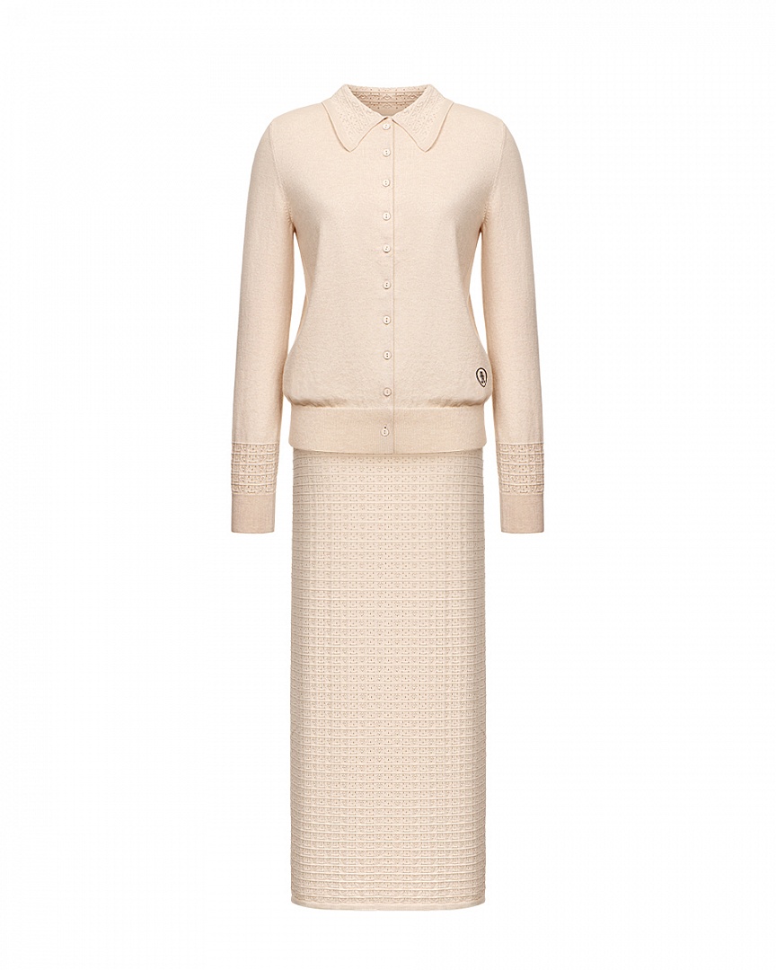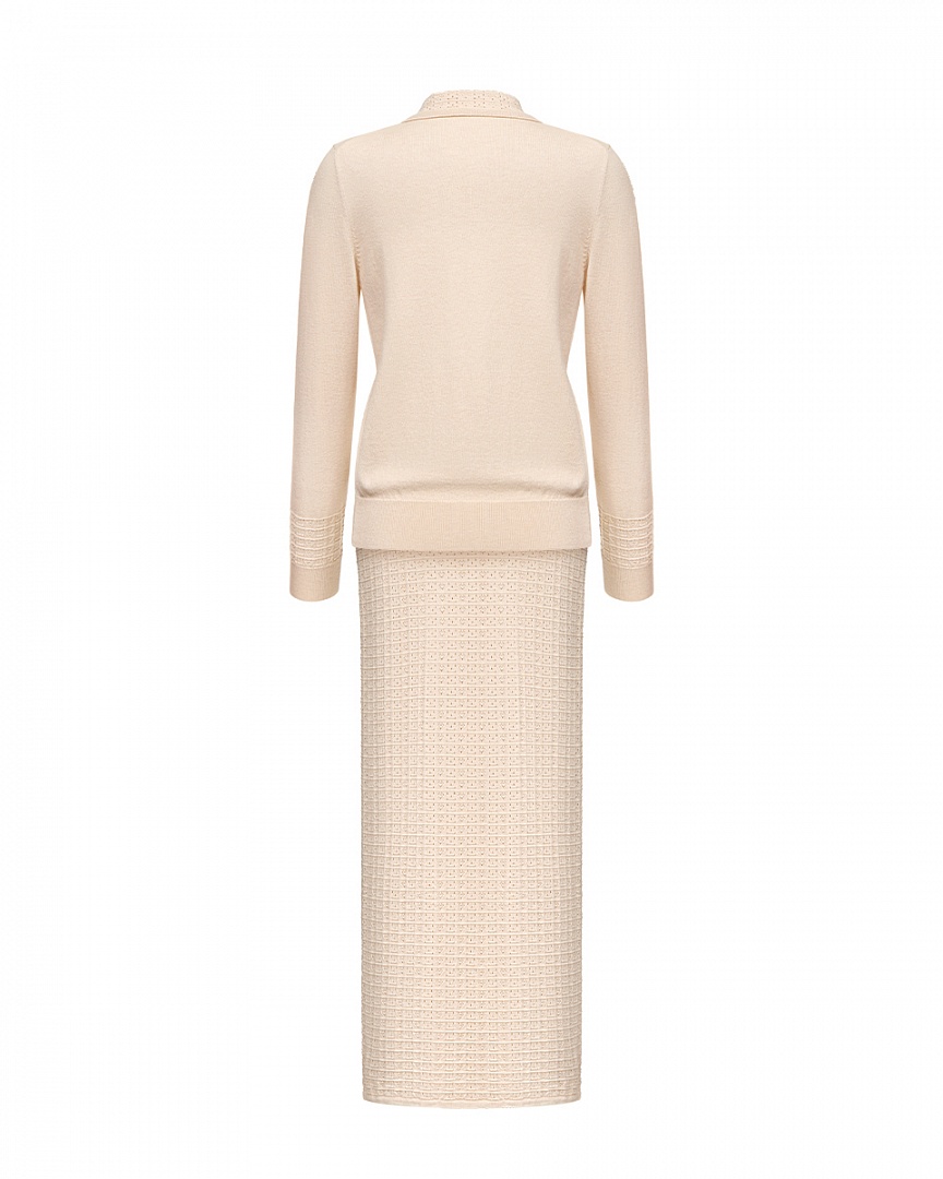 Комплект из мягкого трикотажа из смеси шерсти мериноса и хлопка. Укороченный кардиган с декоративными элементами и прямая юбка с ажурным переплетением (юбка на подкладке). Небольшая вышивка контрастного цвета.