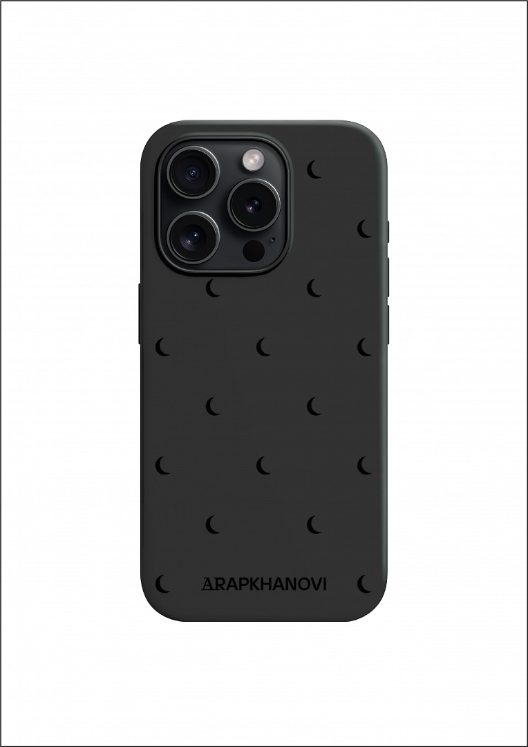 Чехол для iPhone из плотного матового силикона. Декор в виде полумесяцев и логотипа ARAPKHANOVI нанесен лаком.