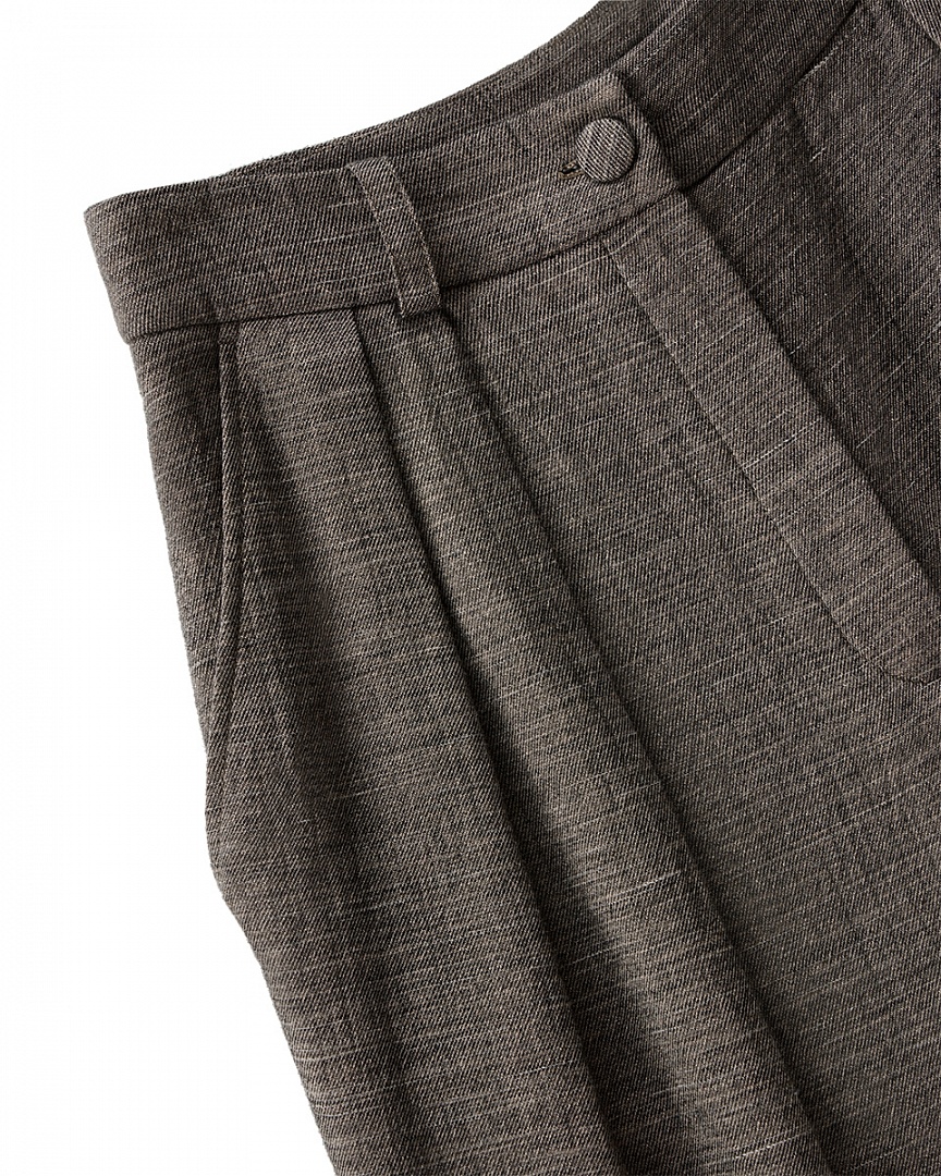 Классические брюки прямого кроя с глубокими складками из фактурного хлопка. Комфортный пояс и застежка на обтянутую пуговицу. Брюки на подкладке.