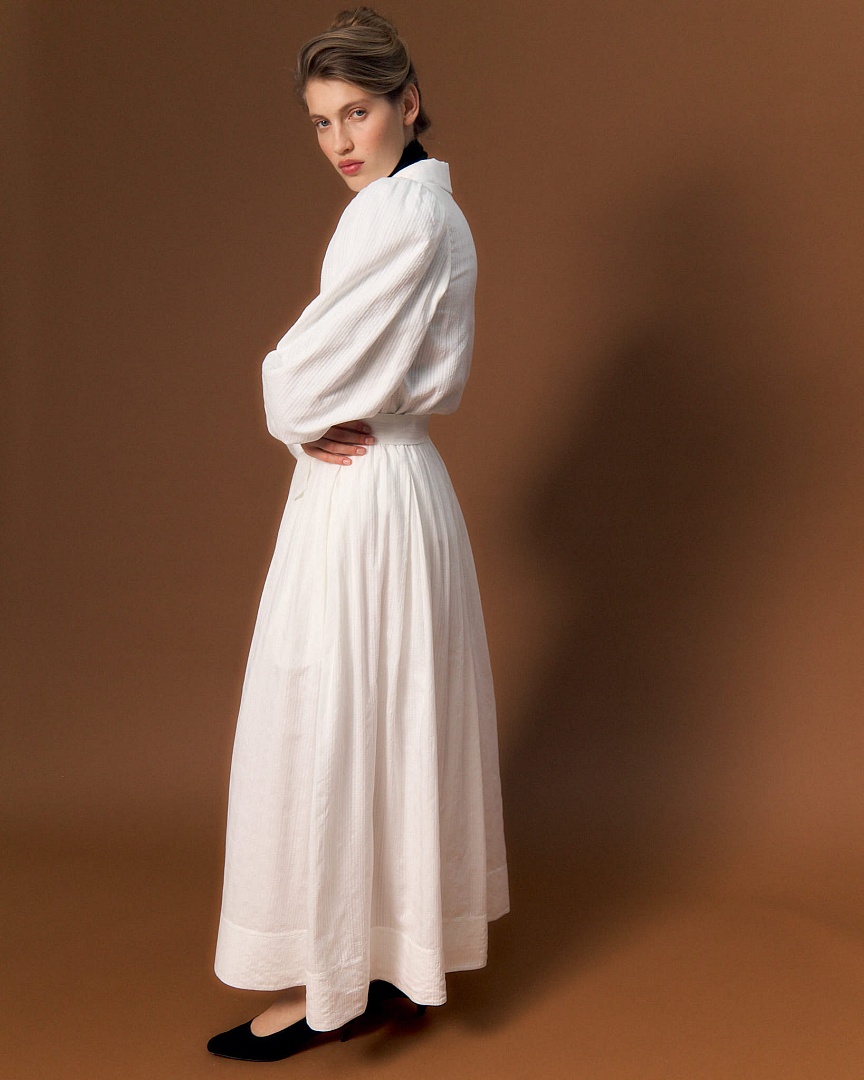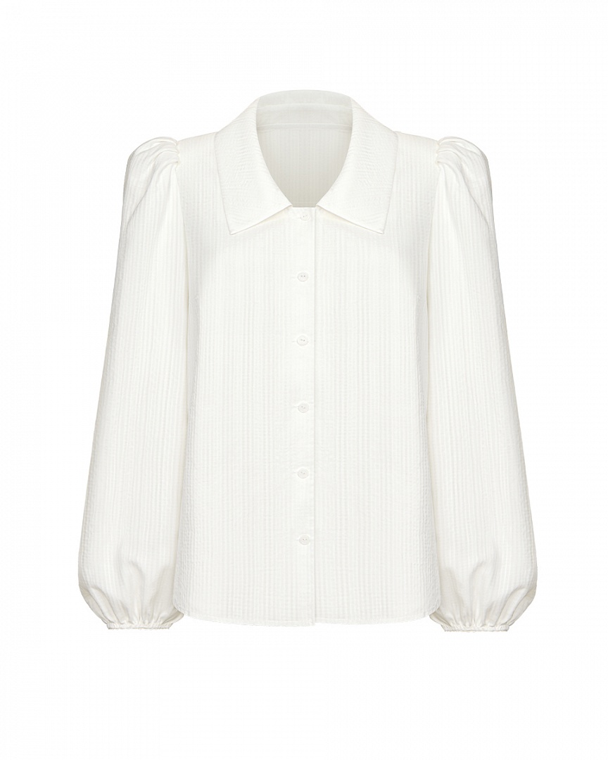 Блуза из фактурного модала с переплетением, имитирующим клетку. Аккуртаный воротник и пышные рукава с ажурной резинкой.