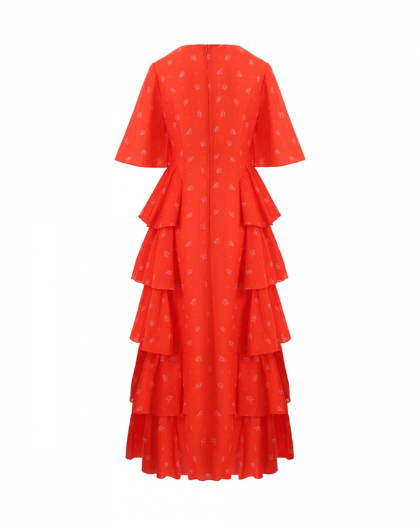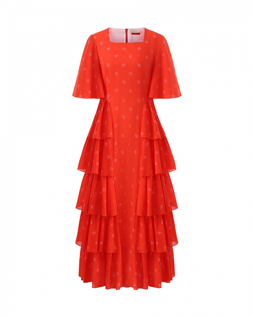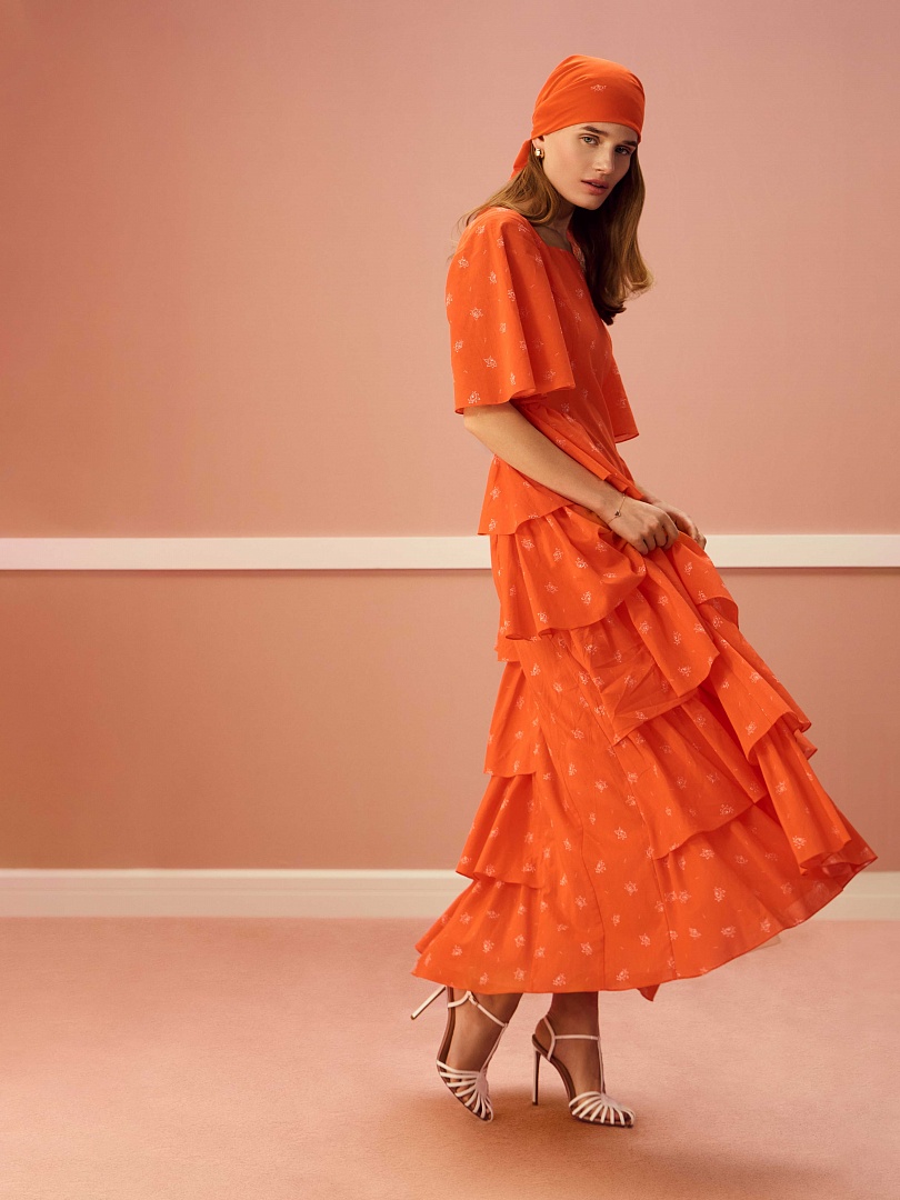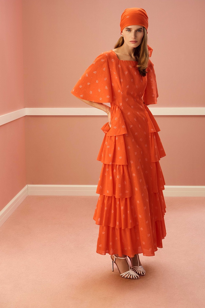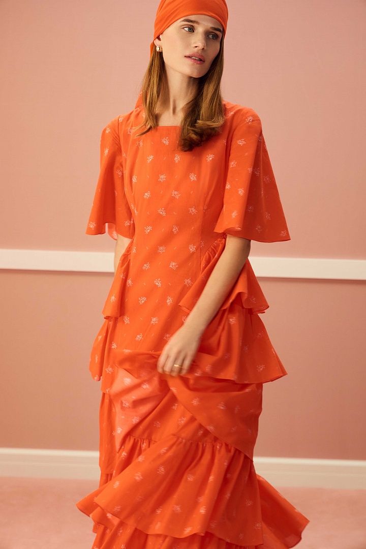 Воздушное платье c квадратным вырезом горловины из 100% хлопкового батиста с авторским принтом. Декоративные рельефы, и объемные воланы расположились на боковых частях платья, образуя утонченный силуэт. Платье прилегающего силуэта.