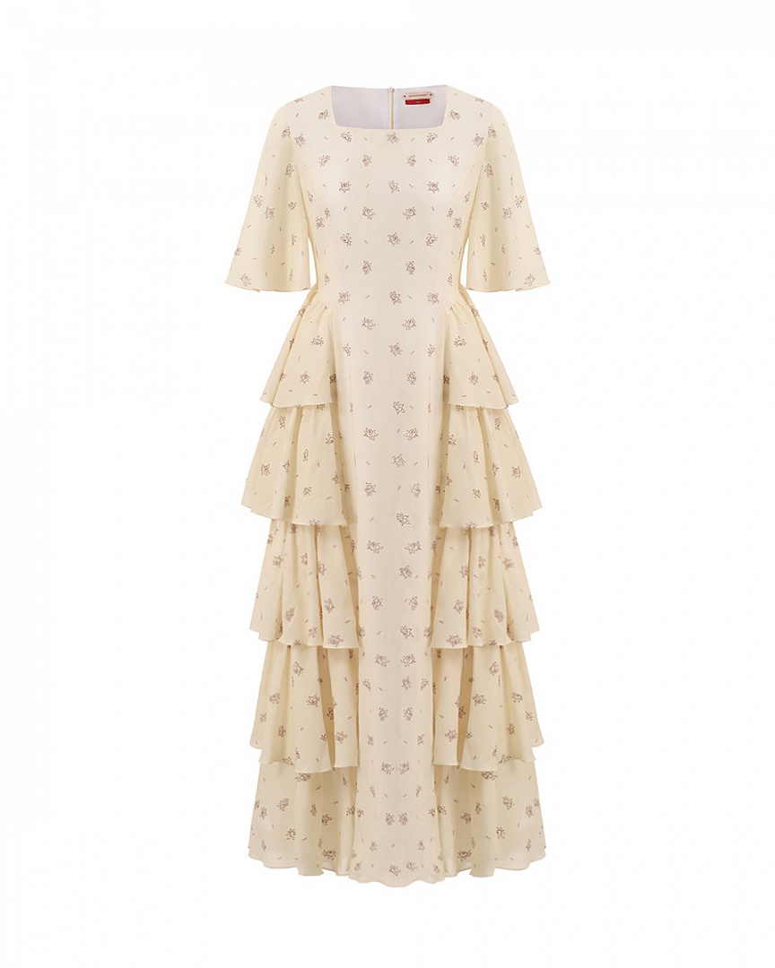 Воздушное платье c квадратным вырезом горловины из 100% хлопкового батиста с авторским принтом. Декоративные рельефы, и объемные воланы расположились на боковых частях платья, образуя утонченный силуэт. Платье прилегающего силуэта.