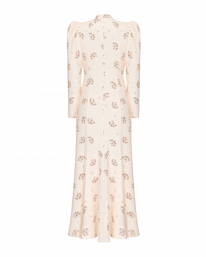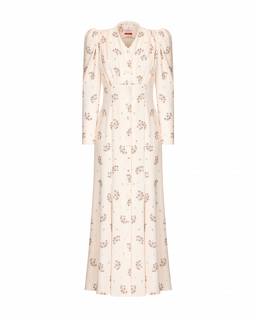 Платье прилегающего силуэта «Фарфоровые сны» выполнено из смесового крепа с авторским принтом. Аккуратные сборки в области плеч и под грудью образуют декоративную линию. Застежка на пуговицы, обтянутые основным материалом.