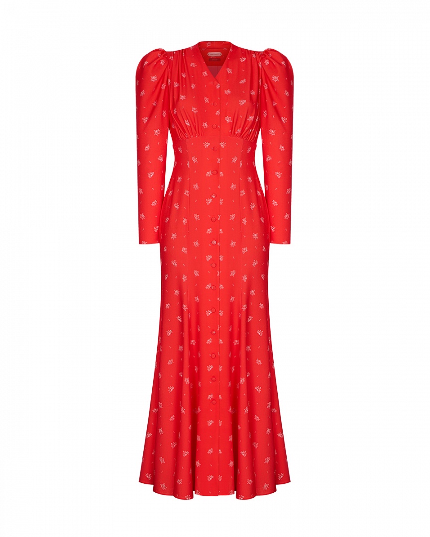 Платье прилегающего силуэта «Фарфоровые сны» выполнено из смесового крепа с авторским принтом. Аккуратные сборки в области плеч и под грудью образуют декоративную линию. Застежка на пуговицы, обтянутые основным материалом.
