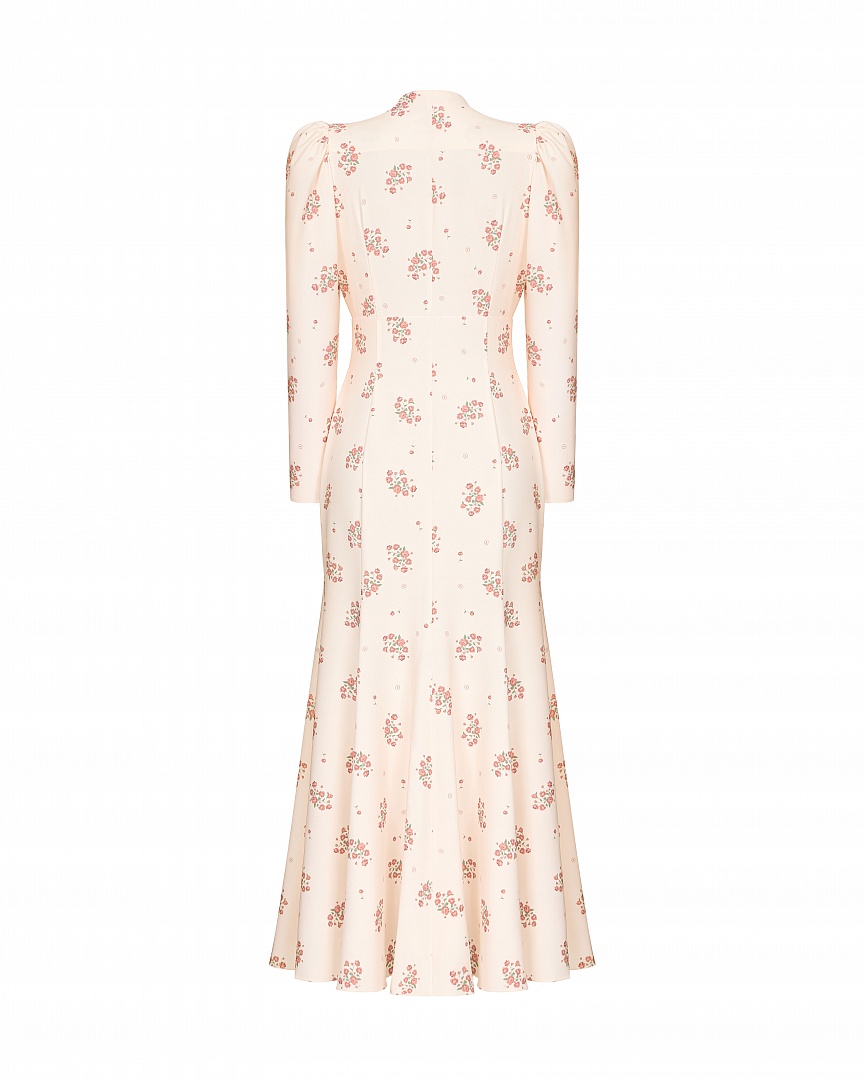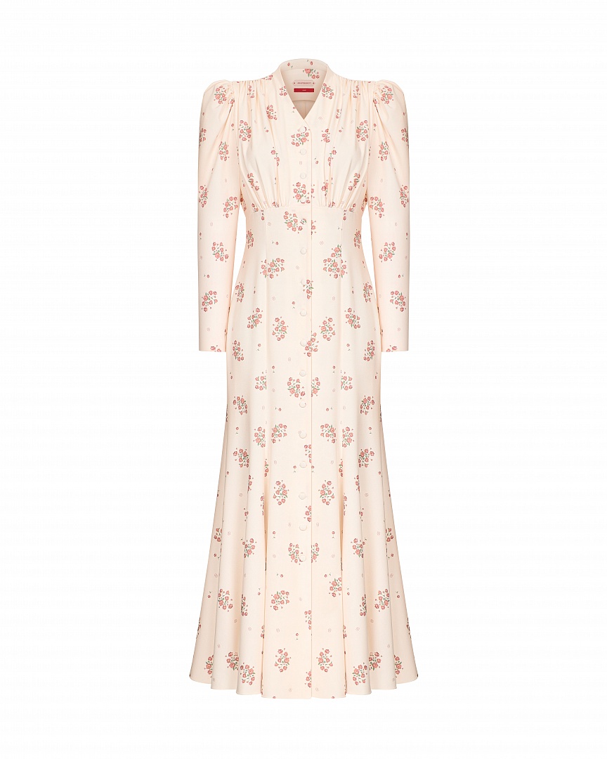 Платье прилегающего силуэта «Фарфоровые сны» выполнено из смесового крепа с авторским принтом. Аккуратные сборки в области плеч и под грудью образуют декоративную линию. Застежка на пуговицы, обтянутые основным материалом.
