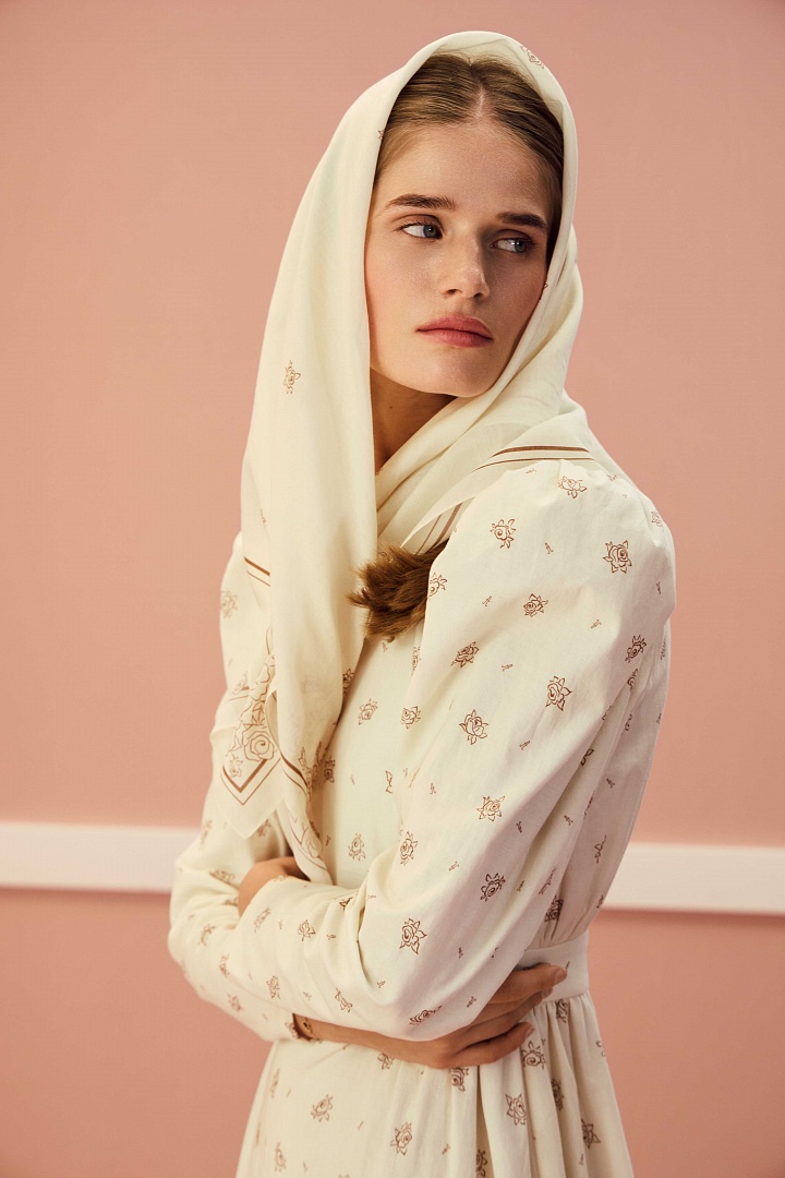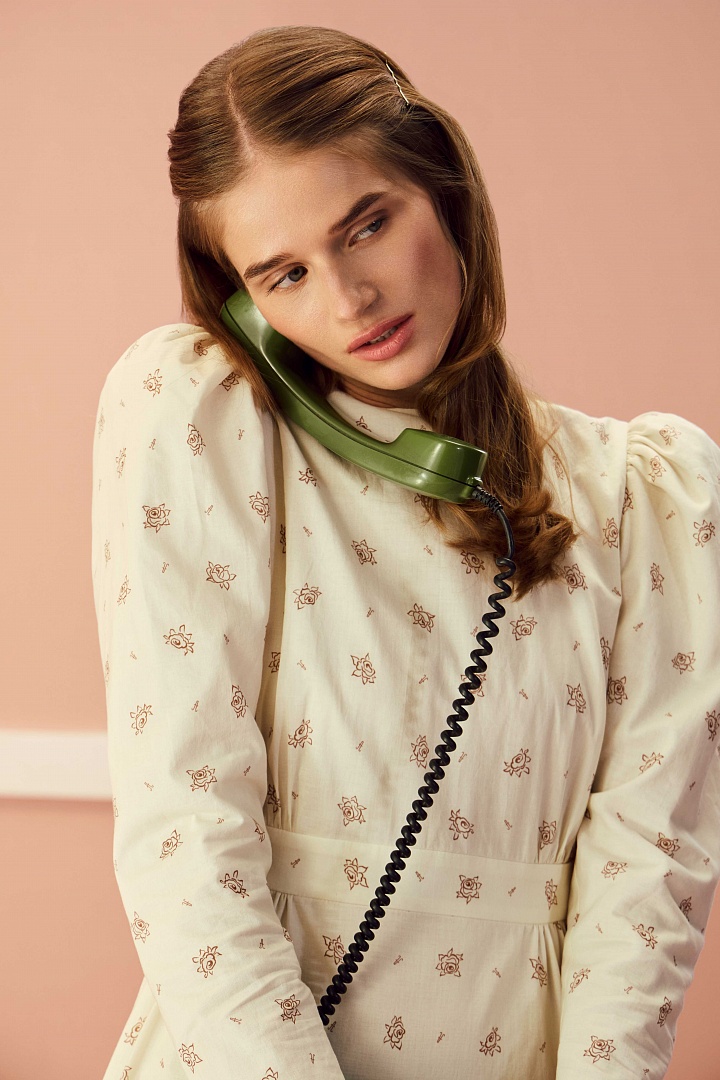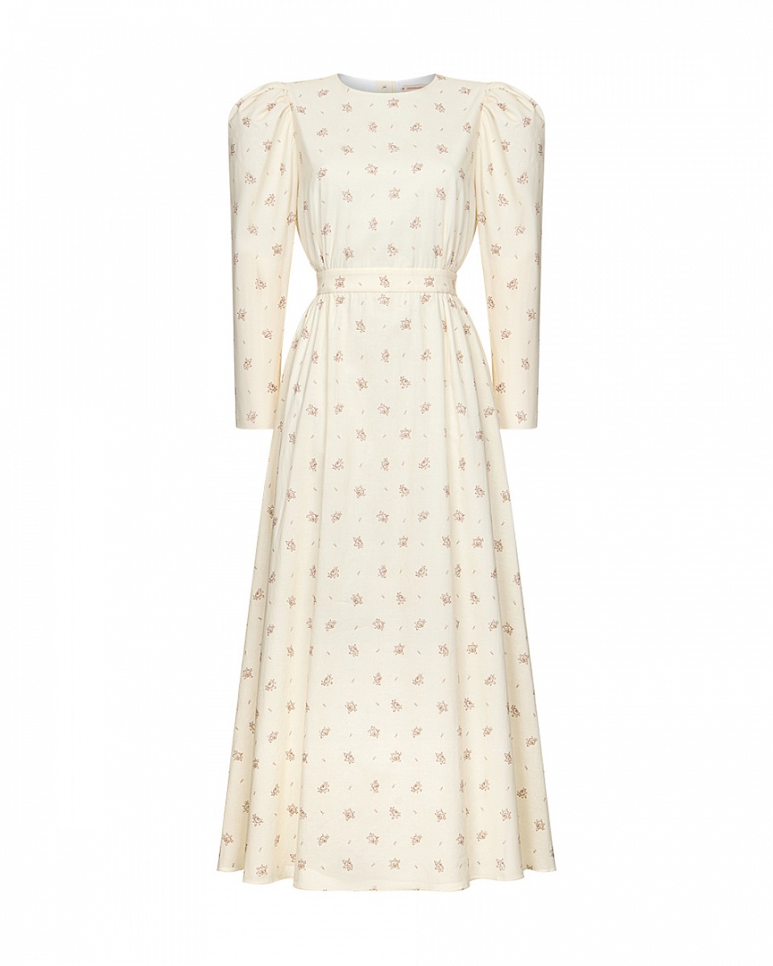 Платье c круглым вырезом горловины из 100% хлопкового батиста с авторским принтом. Аккуратные сборки, направленные к боковым швам, втачной пояс и небольшой объем в области рукава. Застежка на пуговицы вдоль спинки.