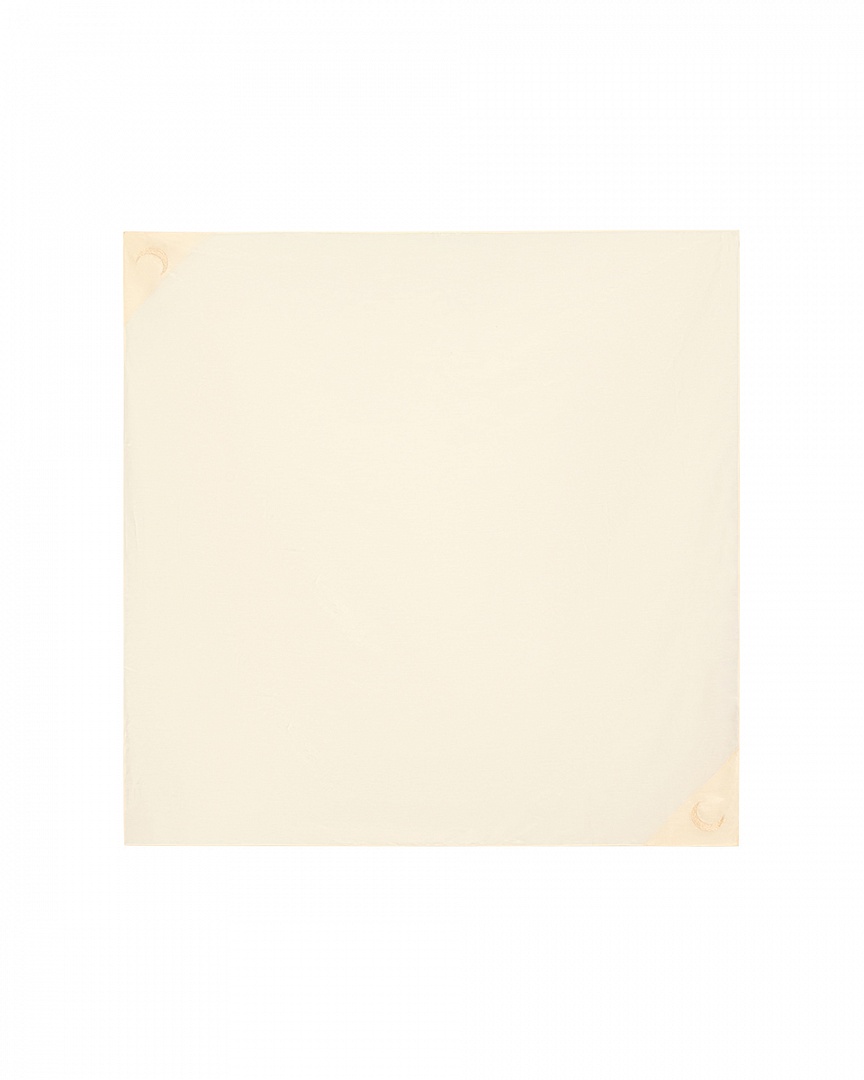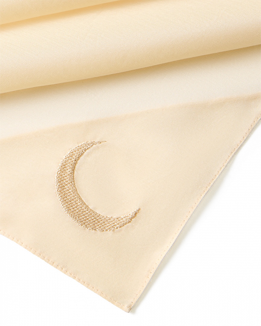 Нежный однотонный платок из шелкового батиста. На двух углах платка расположена вышивка в тон ткани с символом полумесяца. Углы платка усилены дополнительной тканью.