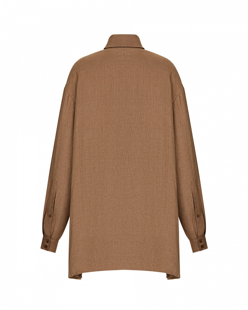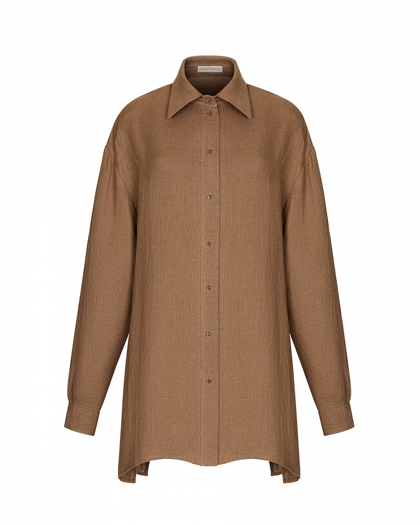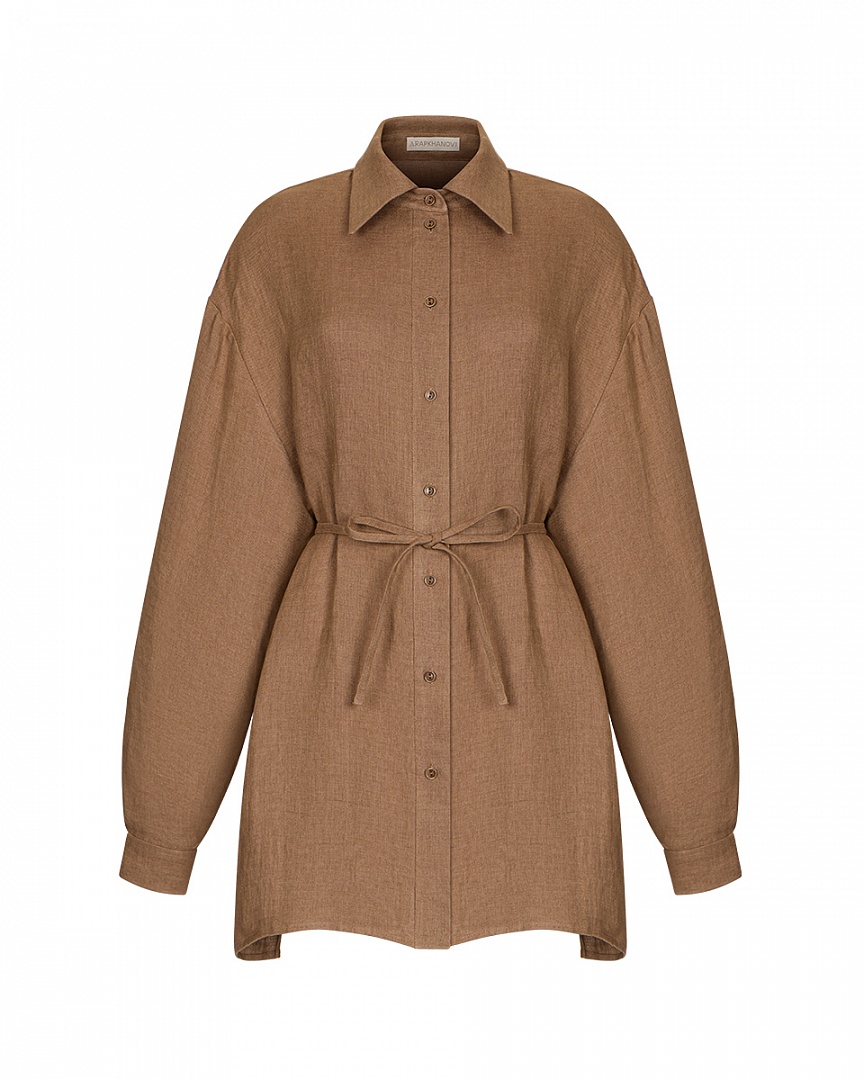 Классическая oversize-рубашка из премиального итальянского льна. Тонкий пояс прилагается к изделию и крепится к боковым швам на невидимые шлевки.