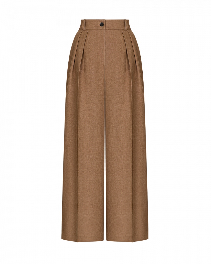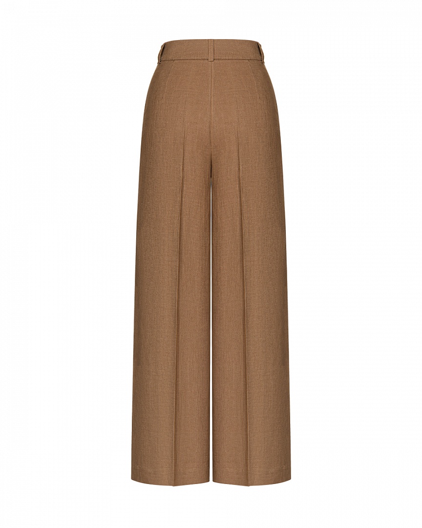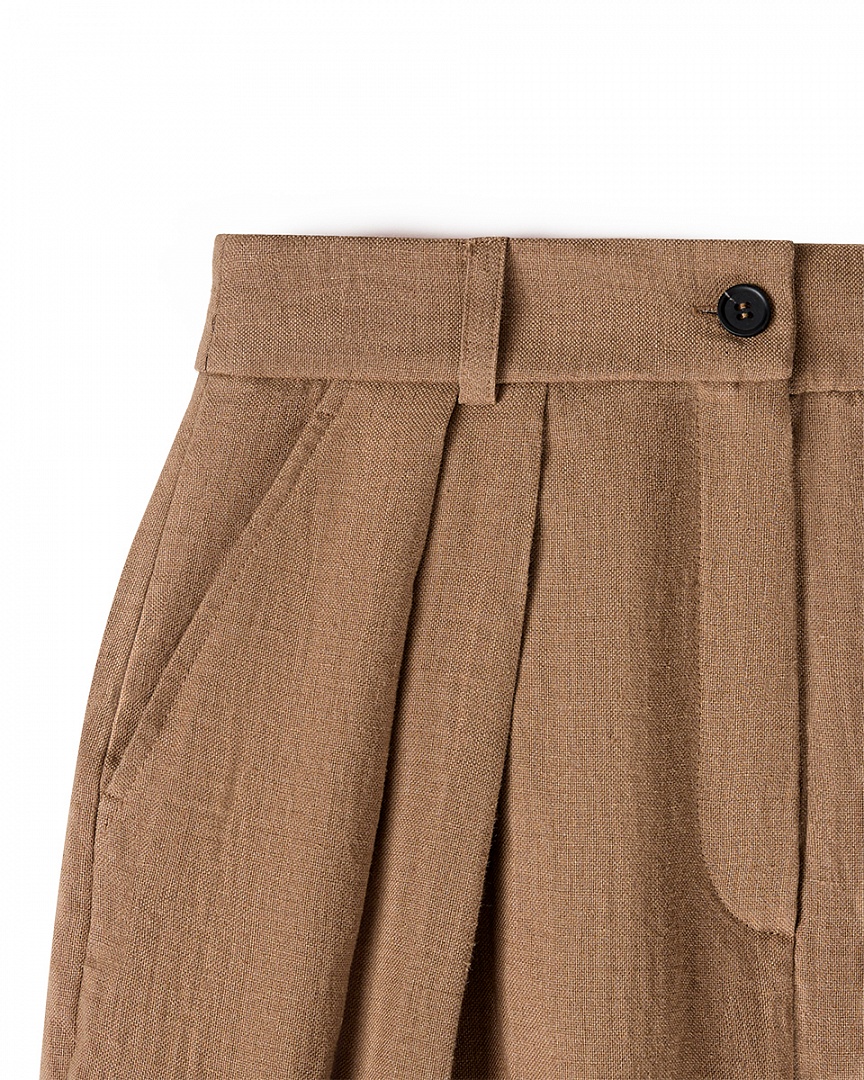 Классические брюки прямого кроя с глубокими складками из премиального итальянского льна. Комфортный пояс и застежка на роговую пуговицу. Брюки на подкладке из хлопкового батиста.