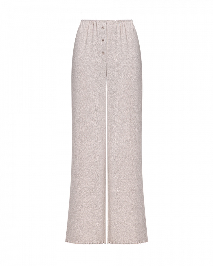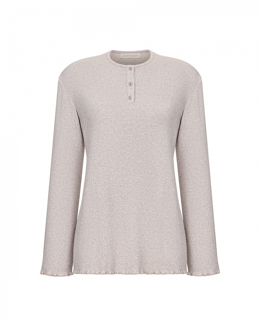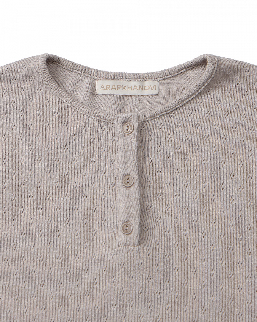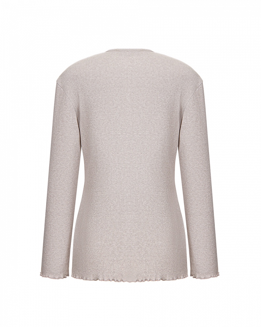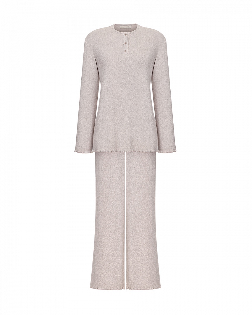 Теплый домашний комплект из мягкого трикотажа с узором. Лонгслив модели henley с рабочей планкой и брюки с декрративным гульфиком. Тонкая обработка краевым швом добавляет легкости изделию и делает комплект более нежным.