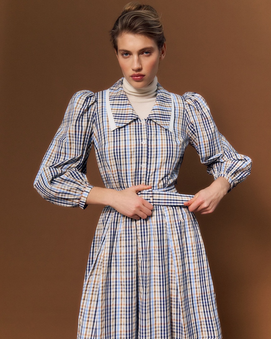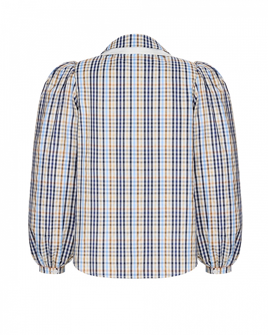 Блуза из сорочечного хлопка в клетку. Двойной воротник и пышные рукава на манжете.