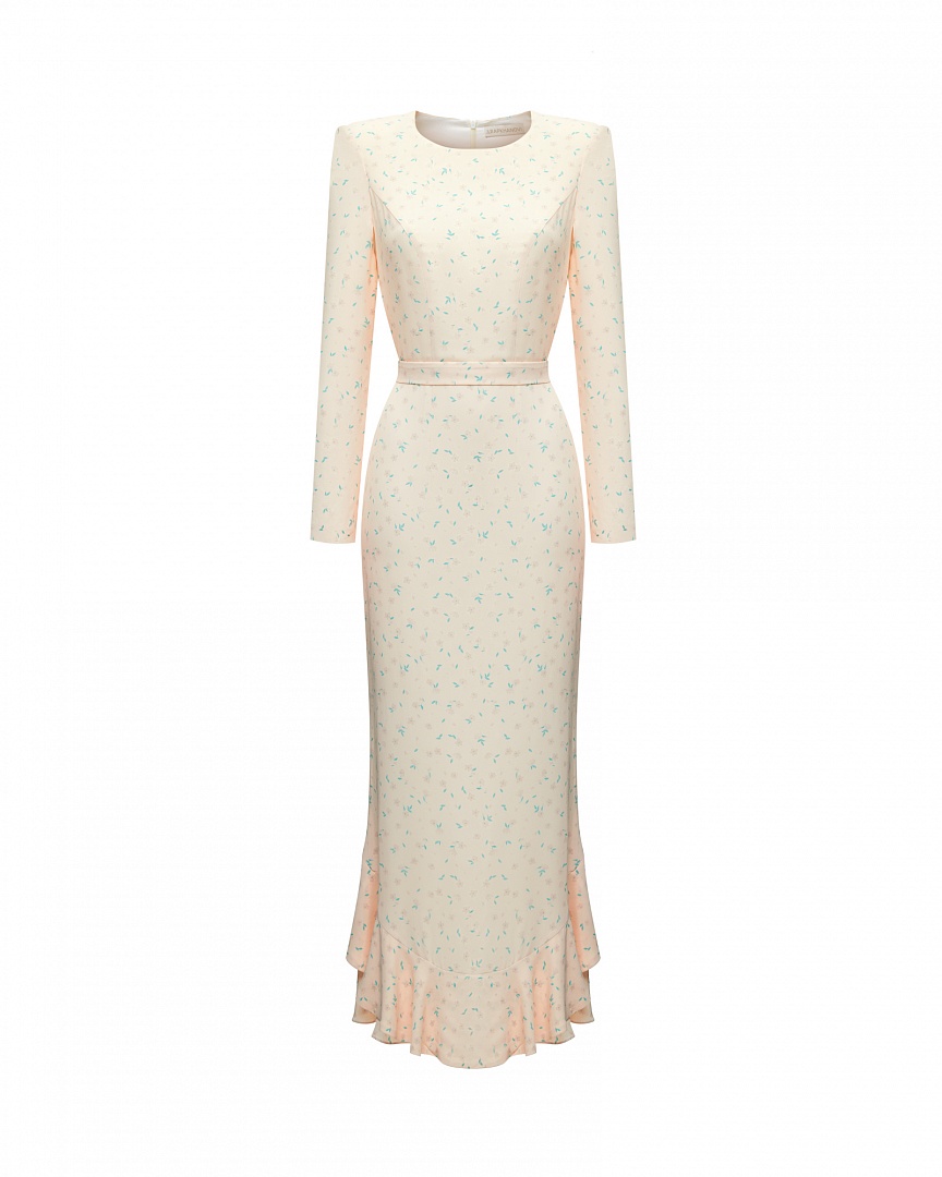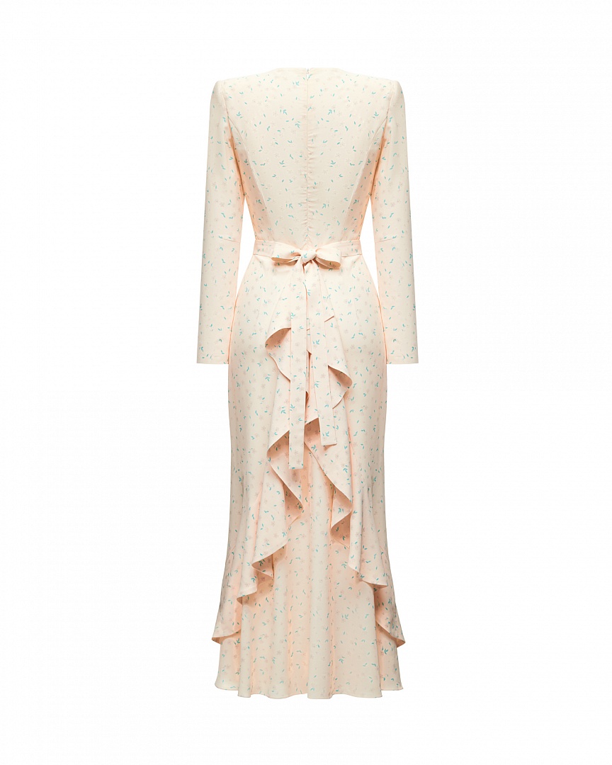 Платье приталенного силуэта с объемными воланами сзади и по низу изделия.