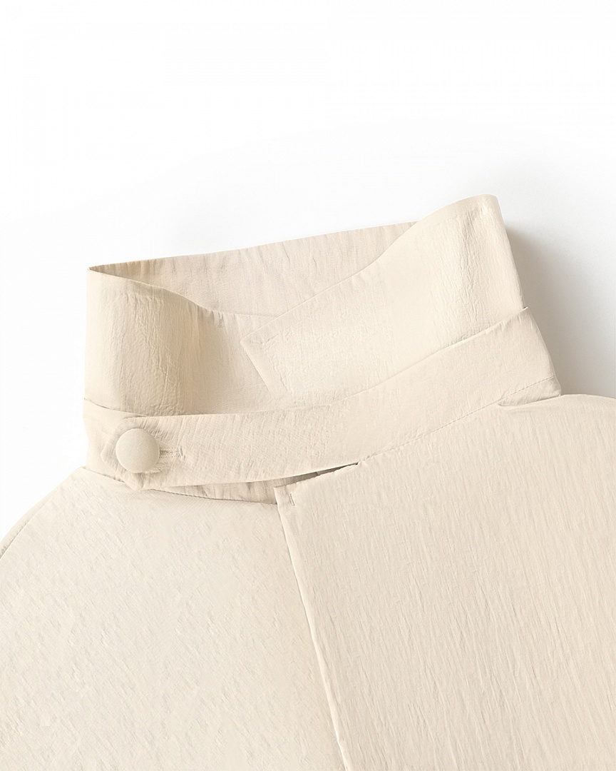 Плащ объемного кроя из технологичной ткани. Супатная застежка с акцентными обтянутыми пуговицами. Воротник с легкостью превращается в "стойку" благодаря специальной скрытой детали. В копмлекте вы найдете пояс.