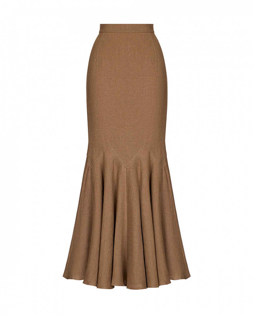 Юбка из премиального итальянского льна. Широкий пояс и застежка на потайную молнию. По низу юбки фигурные подрезы и клинья.