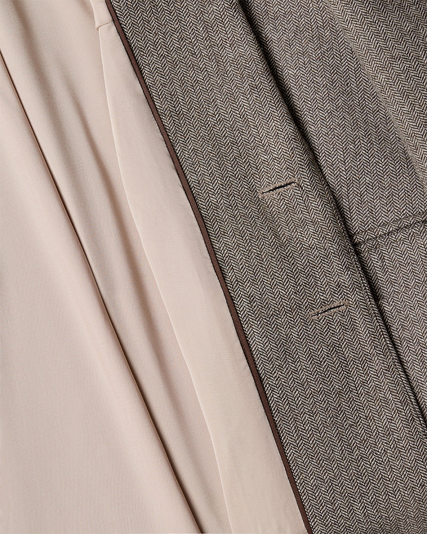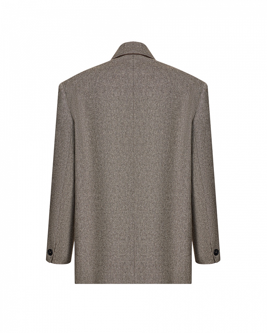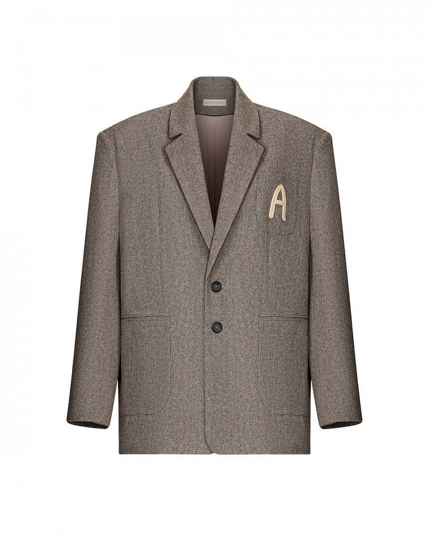 Клубный жакет из фактурной шерсти. Нагрудный карман с буквой A (ARAPKHANOVI), связаной вручную мастерицей из Дзержинска. Двойные карманы в области талии и контрастный кант, едва выглядывающий из лацканов жакета. Oversize-крой и слегка удлиненный силуэт.