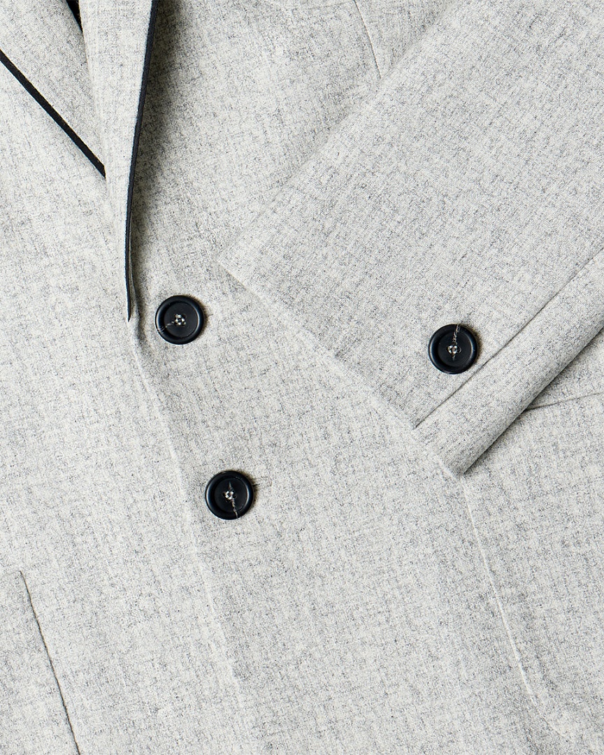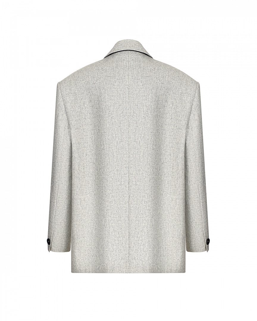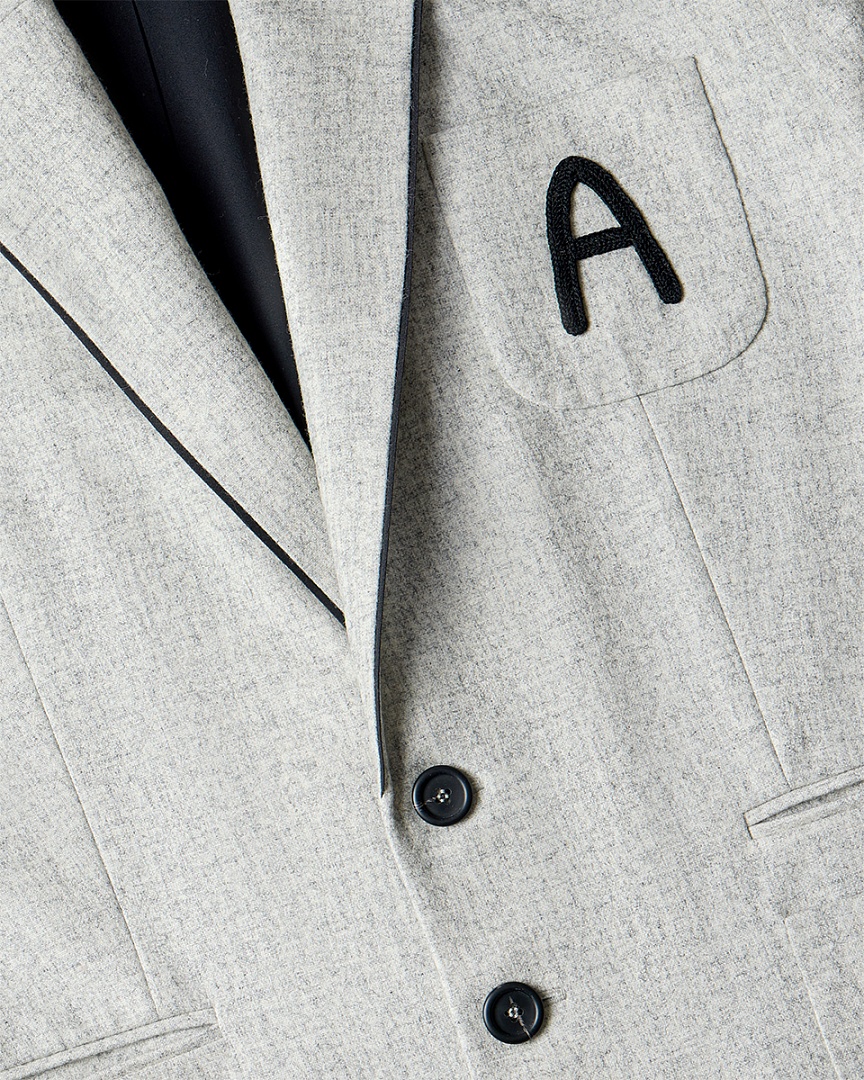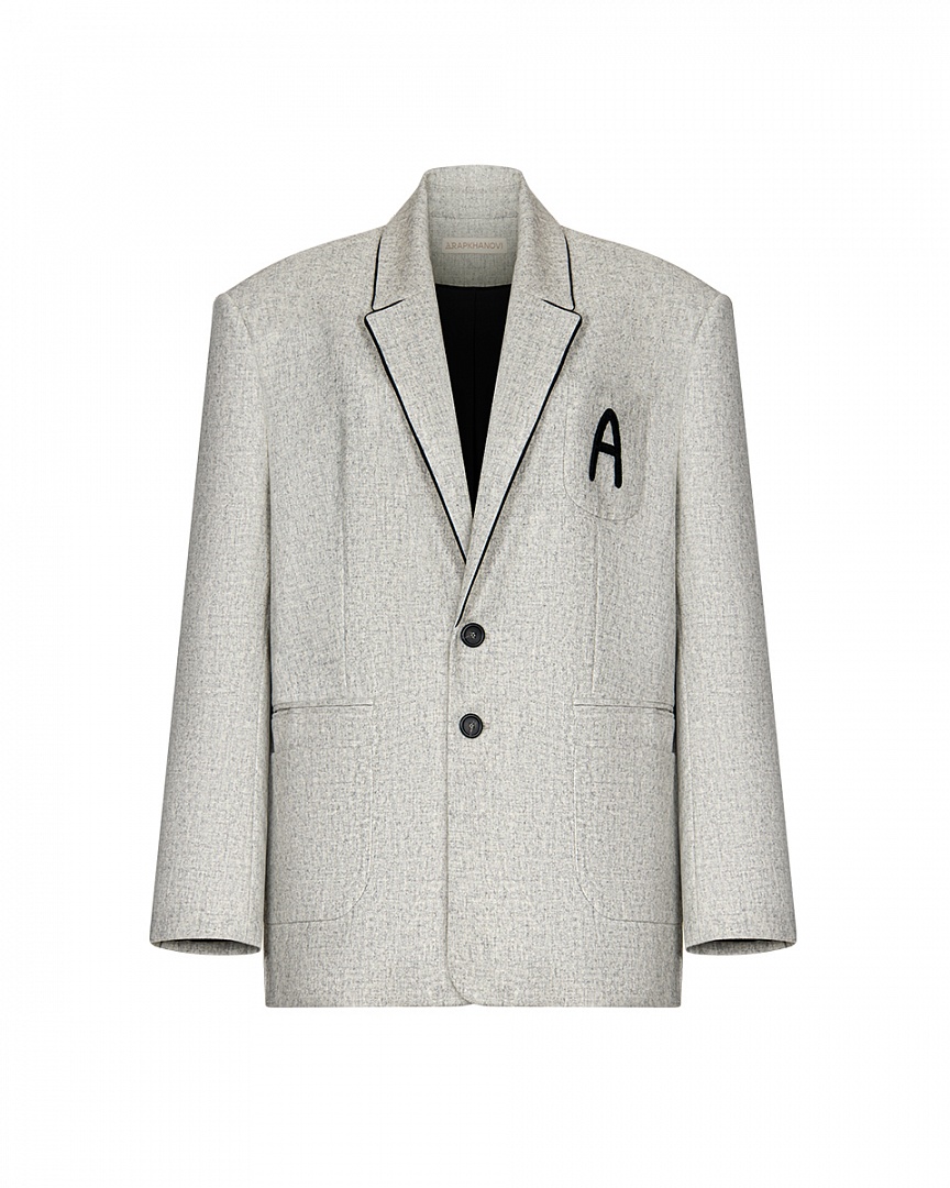 Клубный жакет из фактурной шерсти. Нагрудный карман с буквой A (ARAPKHANOVI), связаной вручную мастерицей из Дзержинска. Двойные карманы в области талии и контрастный кант, едва выглядывающий из лацканов жакета. Oversize-крой и слегка удлиненный силуэт.